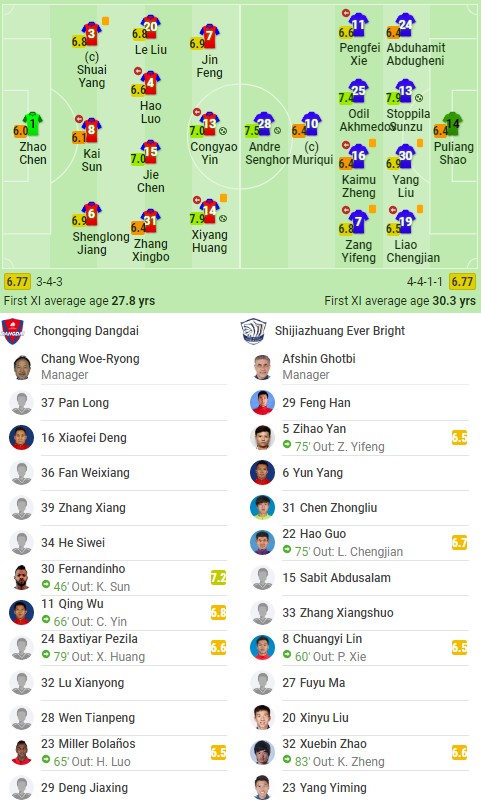 重庆两江竞技首发:1-陈钊、3-杨帅、4-罗皓(64`23-博拉尼奥斯)、6-蒋圣龙(U23)、20-刘乐、31-张兴博、8-孙凯(46`30-费尔南迪尼奥)、15-陈杰、7-冯劲、14-黄希扬(78`24-白合提亚尔(U23))、13-尹聪耀(66`11-吴庆)