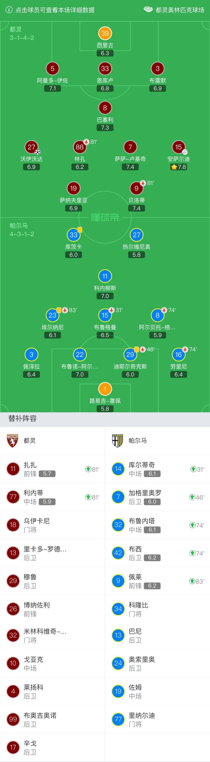 都灵首发:39-西里古、5-阿曼多-伊佐、33-恩库卢、3-布雷默、8-巴塞利、27-沃伊沃达、88-林孔(81`77-利内蒂)、7-萨萨-卢基奇、15-安萨尔迪、9-贝洛蒂(81`11-扎扎)、19-萨纳夫里亚