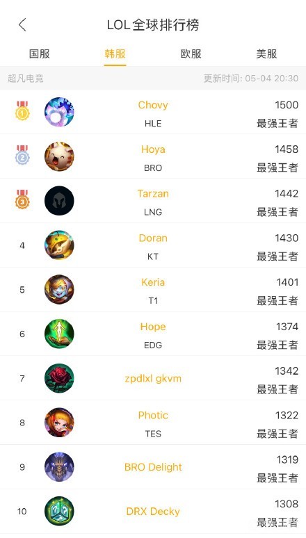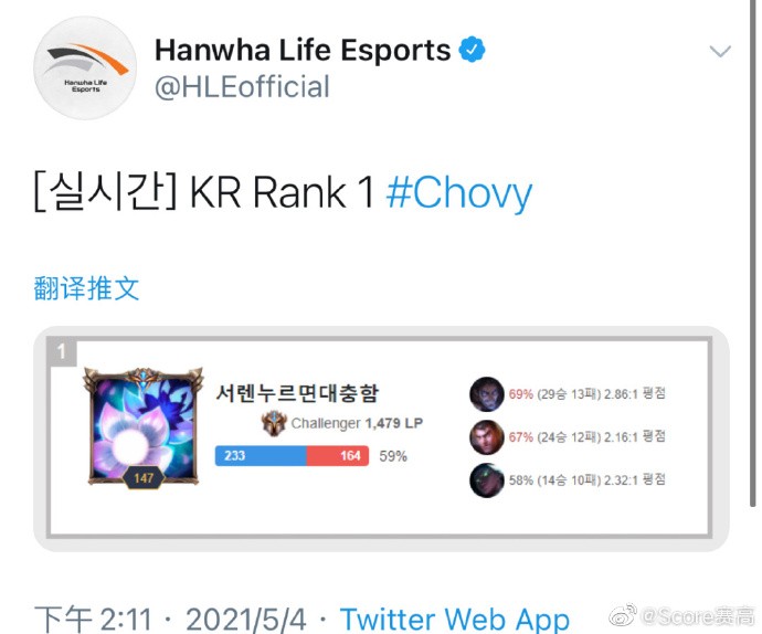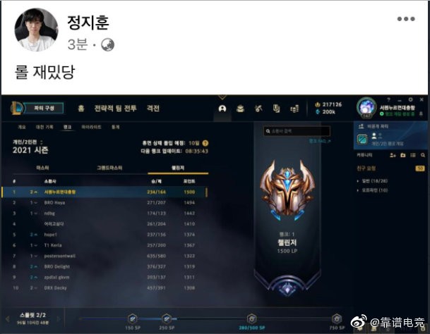 HLE中单Chovy 1500分占据韩服榜首后更新动态:LOL真有趣啊 峡谷全视野 峡谷全视野2021-05-04 21:52HLE中单选手Chovy排位非常顺利,目前已经打到了韩服第一,1500分。Chovy登顶韩服后更新动态:LOL真有趣啊HLE官方:恭喜Chovy韩服登顶网友整活展开更多