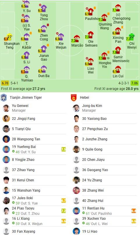 天津津门虎首发:27-滕尚坤、33-宋岳(58`17-伊洛基)、44-卡达尔、3-李松益、29-巴顿、6-高嘉润、39-丛震、7-周通(22`24-朴韬宇)、32-苏缘杰(46`19-白岳峰)、23-钱宇淼(U23)、11-谢维军(58`16-李想)