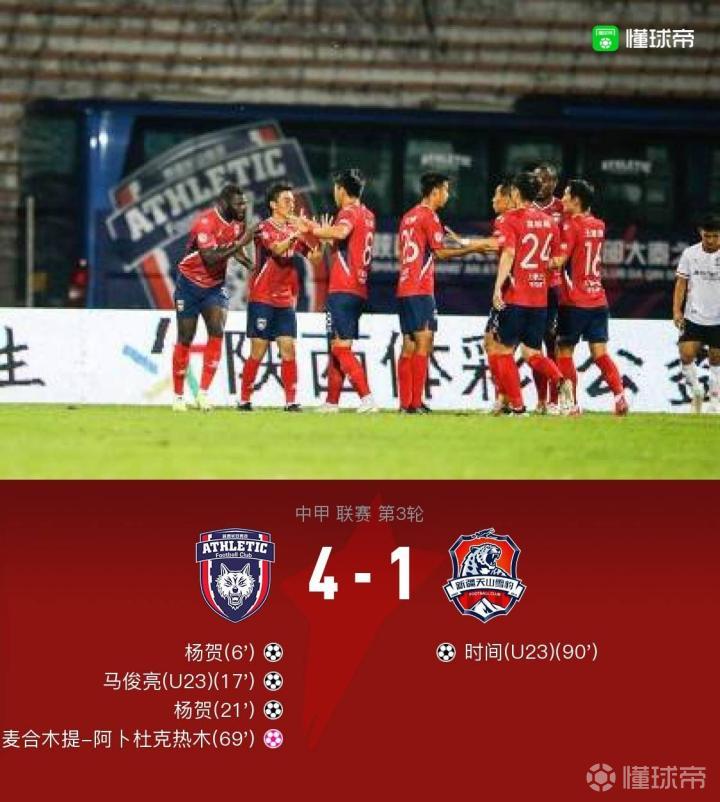 北京时间5月5日19:35,中甲第3轮,陕西长安竞技对阵新疆天山雪豹。杨贺梅开二度,马俊亮破门,麦合木提-阿卜杜克热木乌龙,时间扳回一城。最终,陕西4-1新疆。