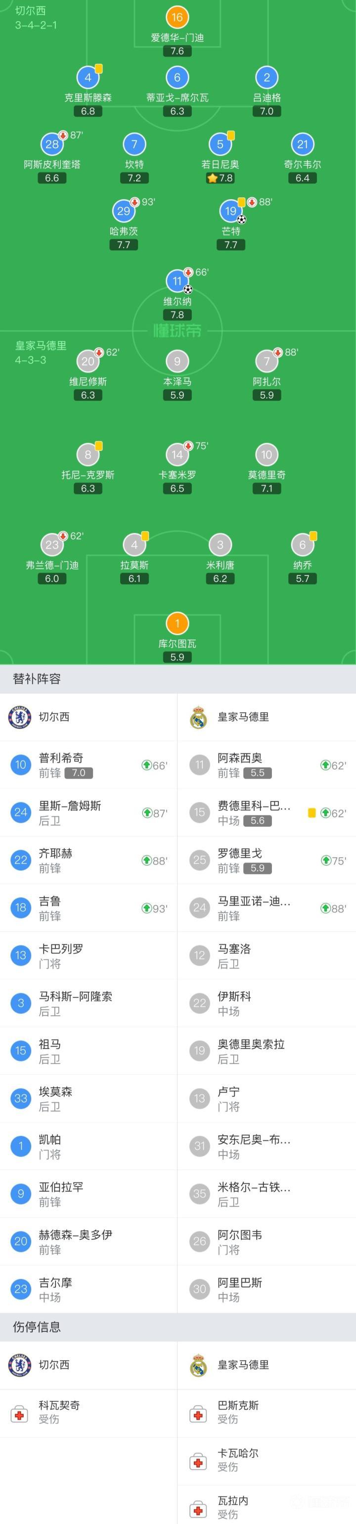 皇家马德里首发:1-库尔图瓦、6-纳乔、3-米利唐、4-拉莫斯、23-弗兰德-门迪(63' 15-费德里科-巴尔韦德)、8-托尼-克罗斯、14-卡塞米罗(76' 25-罗德里戈)、10-莫德里奇、20-维尼修斯(63' 11-阿森西奥)、7-阿扎尔(89' 24-马里亚诺-迪亚斯)、9-本泽马;