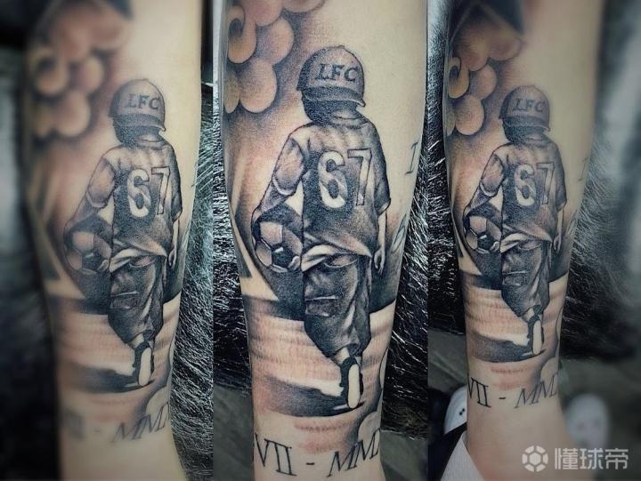 埃利奥特自小便是利物浦球迷,而67号也正是他在利物浦如今的号码。画面中,小男孩手持一颗足球向着远方走去,头上还戴着一顶印有LFC(即利物浦)的帽子,或许想要表现的是埃利奥特童年时的样子。埃利奥特本人以及不少利物浦球迷都对这个文身感到非常喜欢。