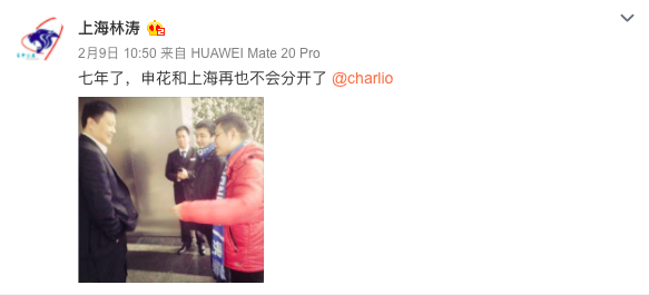 球迷在微博上晒出了一张7年前与董事长吴晓晖当面交流的图片,写道“上海和申花,再也不会分开了”——一如7年前的横幅上写着的那句祝愿。