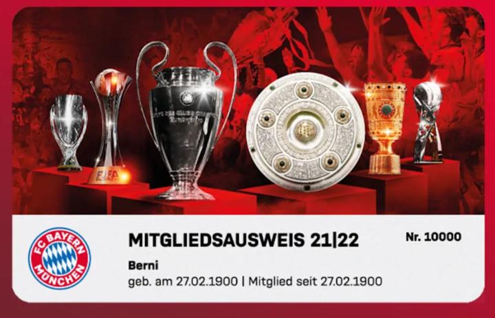 拜仁慕尼黑将在2021-22赛季推出一款新的会员卡,这张会员卡上是拜仁慕尼黑的六冠王图案,印着拜仁上赛季所获得的欧冠、德甲、德国杯、欧洲超级杯、德国超级杯以及世俱杯六座奖杯。