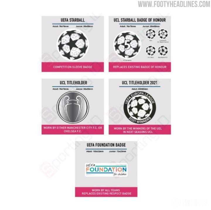 此外,欧冠卫冕冠军仍会佩戴有象征2021欧冠夺冠的奖杯臂章(替换球形章),而欧联杯冠军球队则会在下赛季的球形臂章外侧添加一圈“2021欧联杯冠军”的文字。