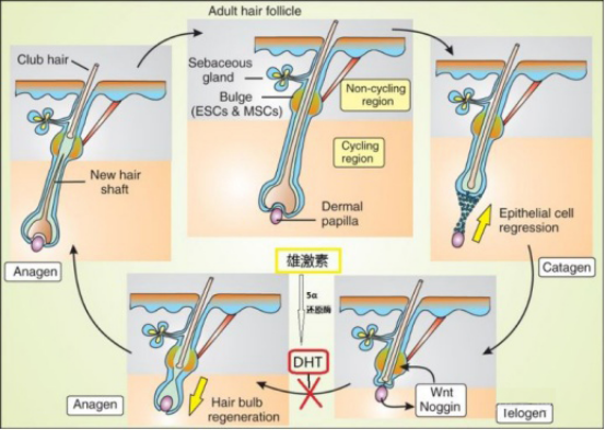 人头皮中的毛囊及皮脂腺是雄激素的靶器官,5α-还原酶促进雄激素转化为双氢睾酮,抑制毛囊生长。