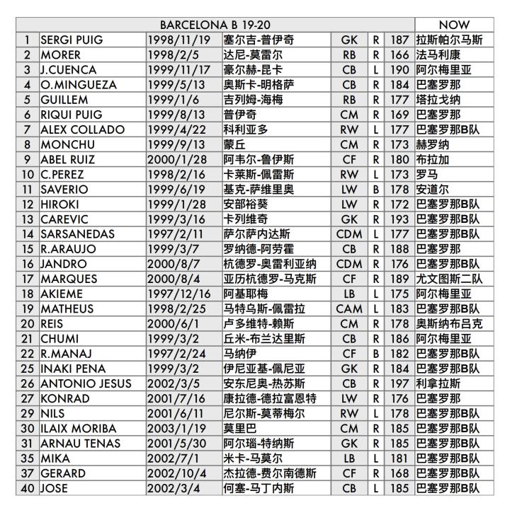 19-20赛季巴塞罗那B队球员大名单(附:目前效力球队)