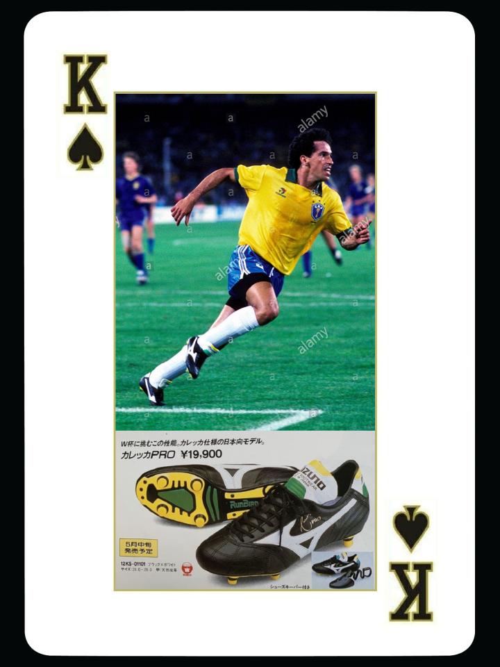 对美津浓推动第二大的球星是80年代巴西著名前锋卡雷卡,他是第一为美津浓代言的巴西球星,在圣保罗时期就开始穿着morelia球鞋,之后在意甲那不勒斯和马拉多纳一起大杀四方,也将美津浓球鞋带到了意大利。1990年世界杯,美津浓为卡雷卡推出了巴西配色的专属球鞋,而且巴西队有多位球星使用,这款鞋的设计非常特别,是最早采用交叉走线的美津浓球鞋。只可惜1990年世界杯实力强大的巴西队被马拉多纳的世纪之传绝杀。