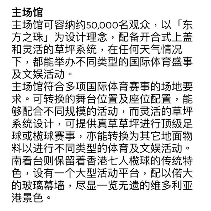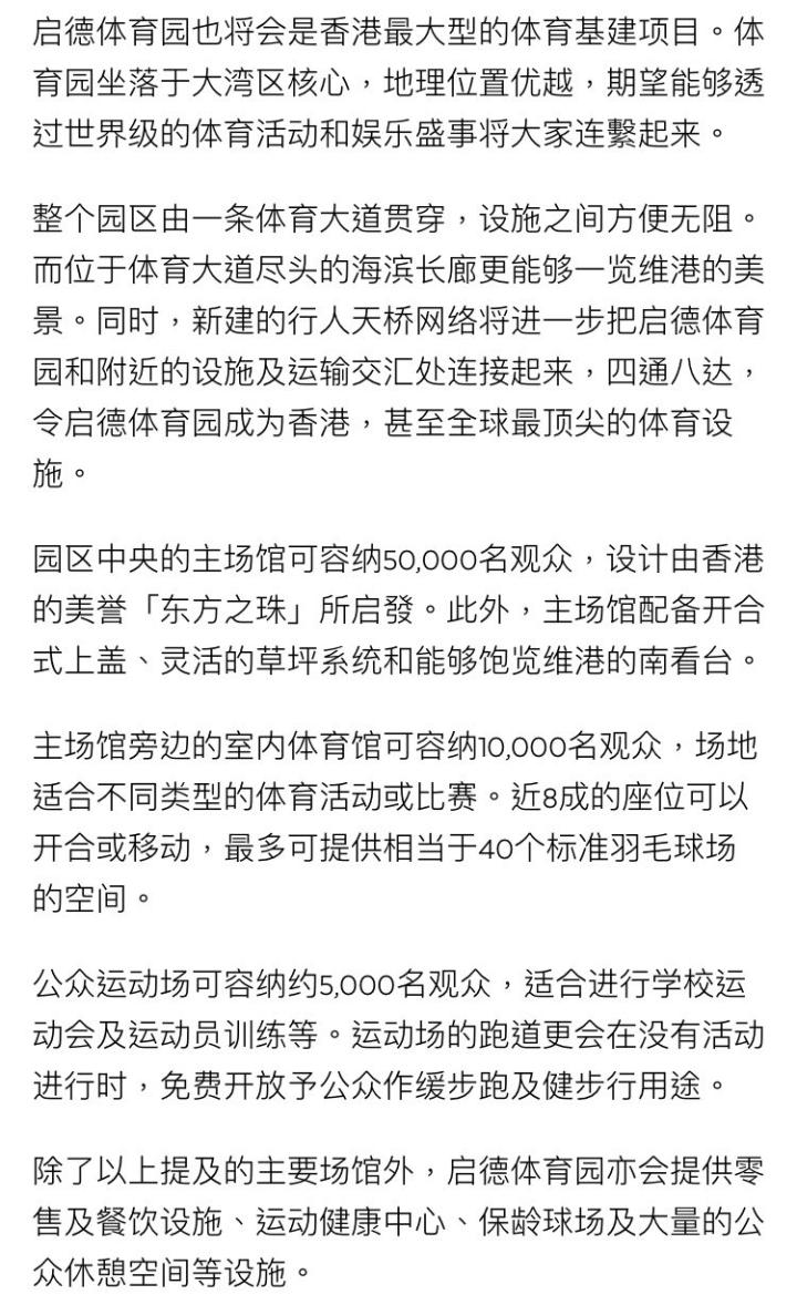 【香港启德专业足球场】广州恒大专业足球场的建设正在如火如荼进行中,预计2023年将要落成,成为继香港大球场,旺角大球场,肇庆新区足球场后粤港澳大湾区内的第四座专业足球场。 可能很多人不知道的是,粤港澳大湾区内除了备受瞩目的恒大大球场外还将迎来另一座新的专业足球场——香港启德体育园(Kai Tak Sports Park)内一座拥有50,000座席的专业足球场,可举办顶级足球赛事及橄榄球赛事,预计2023年落成后将取代现时的香港大球场(Hong Kong Stadium)成为香港最大的体育场馆。 资料来源:启德体育园官方网站:https://kaitaksportspark.hk/cs YouTube影片:https://youtu.be/Y2sk7zC780E(大S看世界)