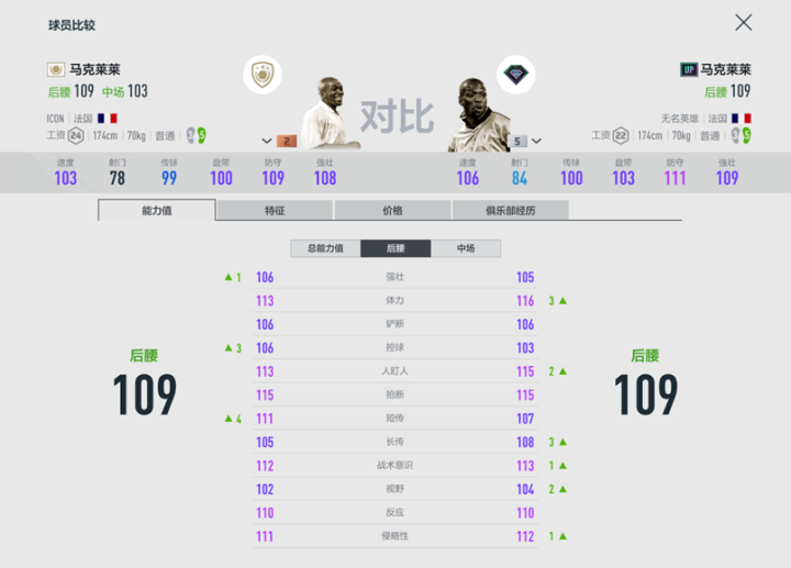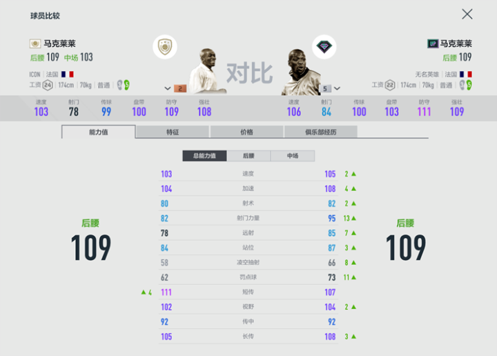 同样将游戏中目前卡价相近的ICON马克莱莱2强与UP赛季马克莱莱5强进行对比,可以发现,UP赛季马克莱莱5强不仅在防守端不输ICON卡,而且在进攻端也有着相对亮眼的数据。与此同时,UP赛季马克莱莱还多一个好胜心强的特性。可以说UP赛季马克莱莱5强更具“扫荡性”,对于资金相对紧凑暂时难以购入银卡ICON的玩家来说,5强的UP马克莱莱无疑是上佳选择,补强阵容的同时还可以腾出工资空间