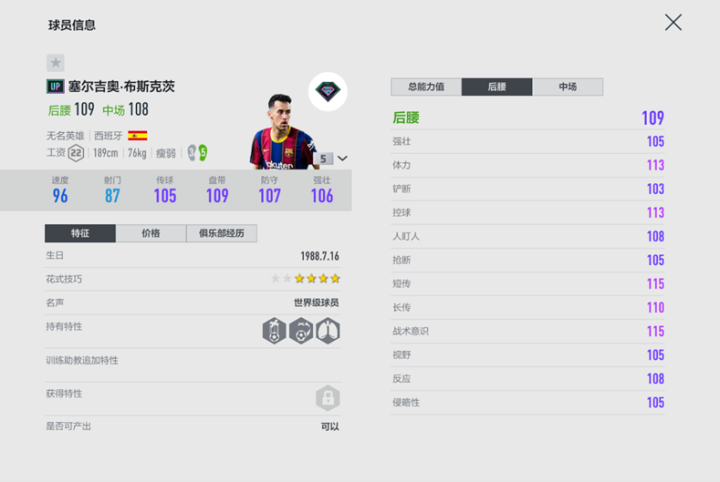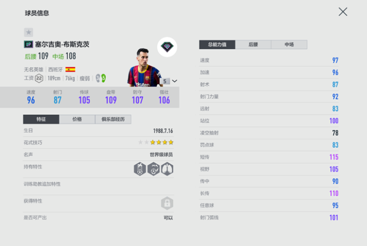 防守端UP赛季的布斯克茨的同样出色,113的体力足以让他打满全场,100的灵活和105的抢断数据也足以支撑布教授在拦截上的效率。总而言之,这张UP赛季的布教授是巴萨套玩家后腰位置上除了佩蒂特以外的最佳选择,非队套玩家也可以酌情使用