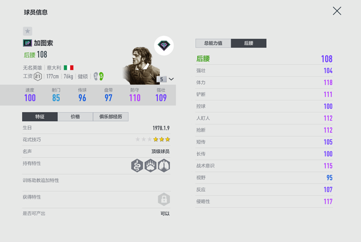 健硕的模型,近乎华丽的防守数据,这张UP赛季的5强加图索是一张非常合格的防守工兵。118的体力、101/99的双速保证了他可以在你需要的位置完成拦截,抢断和协防。而117的侵略性和好胜心强的特性,亦可以让加图索在球队落后时率队打出高效反击。