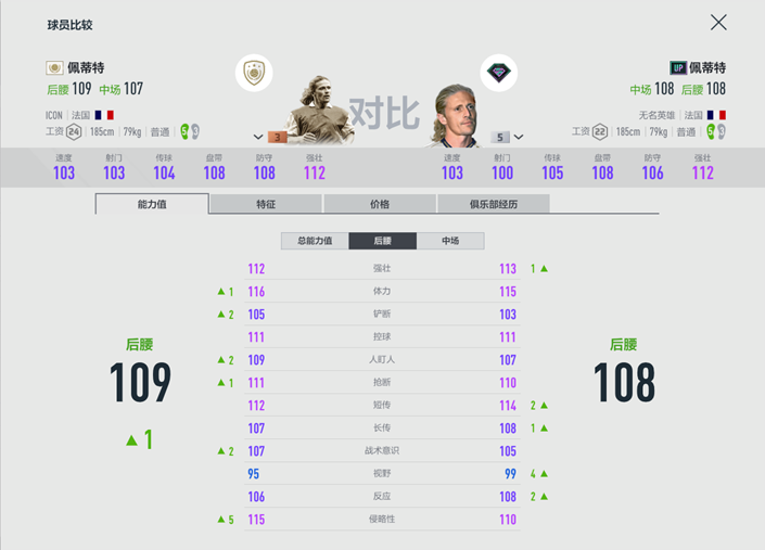 将游戏中目前卡价相近的ICON佩蒂特3强与UP赛季佩蒂特5强进行对比,不难发现,两者仅在侵略性方面有着相对较大的差距,其他后腰数据方面两者的数据基本持平。再结合其他位置上两者的数据以及球员的特性,可以得出UP赛季佩蒂特更适合打稳定防守,阵地战进攻的玩家使用。对于银卡队套玩家来说,UP赛季的5强佩蒂特不仅可以享受银卡套的加成,还可以腾出2点工资在其他位置上进行补强。如果你的球队急需一个稳定性强,侵略性较低的强力后场铁闸,那么UP赛季佩蒂特极有可能是你想要的球员!