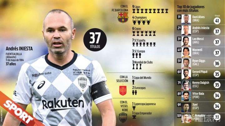 不老小白,37岁的伊涅斯塔和他的37个冠军 此前一直有消息称神户胜利船足球俱乐部将于近日为伊涅斯塔召开一场重要的新闻发布会。就在所有人都以为一代传奇伊涅斯塔要选择退役时,神户胜利船官方宣布与伊涅斯塔续约至2023年。也就是未来的两年内,37岁的伊涅斯塔还将继续为足球挥洒他的汗水。 1984年5月11日,伊涅斯塔出生在西班牙阿尔瓦塞特的一个小村庄,丰特阿尔维利亚(Fuentealbilla)。1996年,12岁的伊涅斯塔离开阿尔瓦塞特进入拉马西亚青训,出道后一直效力于巴萨直到2018年夏天才离开。离开欧洲足坛后,伊涅斯塔前往日本,在J联赛的神户胜利船效力至今。 在他二十多年的职业生涯中,伊涅斯塔先后捧起了37座冠军奖杯。进入巴萨一队后的十六年中,小白帮红蓝军团赢下了9次西甲冠军、4次欧冠冠军、6座国王杯、7座西班牙超级杯、3座欧洲超级杯和3座世俱杯。加盟神户胜利船后,伊涅斯塔则帮助球队拿下过一座日本天皇杯的奖杯和一次日本超级杯冠军。 而在国家队中,伊涅斯塔更是功不可没。在跟随斗牛士军团先后捧起两座欧洲杯冠军的同时,2010年7月11日于南非世界杯西班牙对荷兰决赛中凭加时下半场一球定江山,令西班牙1:0击败荷兰,为国家队首次夺得世界杯冠军。 37座冠军也让伊涅斯塔和梅西还有马克斯维尔一起成为了全球拥有冠军数量第二多的球员。