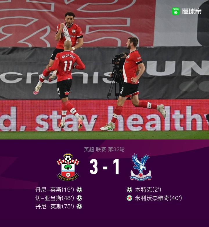 北京时间5月12日3:15,英超第32轮,南安普顿主场对阵水晶宫。上半场,本特克抽射破门,丹尼-英斯转身抽射扳平,雷蒙德兜射被扑,亚当斯低射被扑出,扎哈造点,米利沃杰维奇失点。下半场,亚当斯破门反超比分,本特克单刀推射打偏,英斯捅射梅开二度,最终,南安普顿3-1逆转战胜水晶宫。