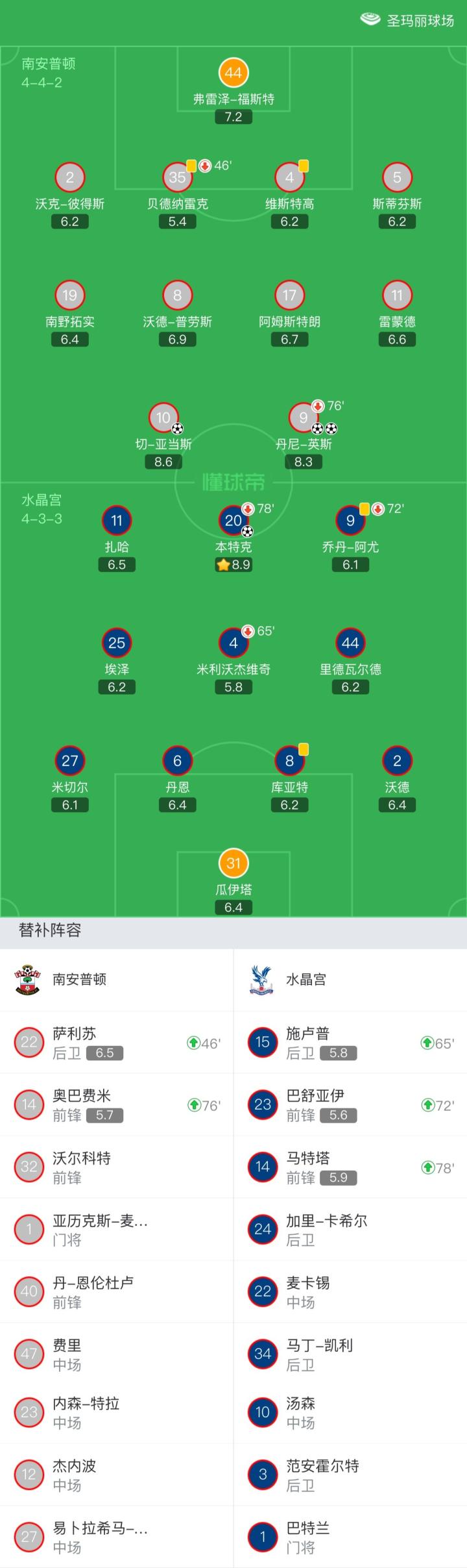 水晶宫首发:31-瓜伊塔、27-米切尔、6-丹恩、8-库亚特、2-沃德、44-里德瓦尔德、4-米利沃杰维奇(65`15-施卢普)、25-埃泽、9-乔丹-阿尤(72`23-巴舒亚伊)、11-扎哈、20-本特克(78`14-马特塔)