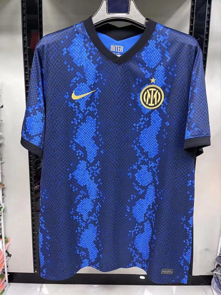 从曝光的实物谍照中能够看到,这件新球衣采用了独特的蛇纹图案设计,并且未采用传统蓝黑条纹设计,而是通过深浅不同的蓝色打造出全新的条纹样式。球衣胸前的俱乐部徽章以及Nike Swoosh均采用金色设计,黑色V领内加入金色俱乐部名称“INTER”。由于球衣胸前广告赞助商还未确定,因此这件球衣胸前广告位置处于空缺状态,背后下摆处则是联想广告“Lenovo”。