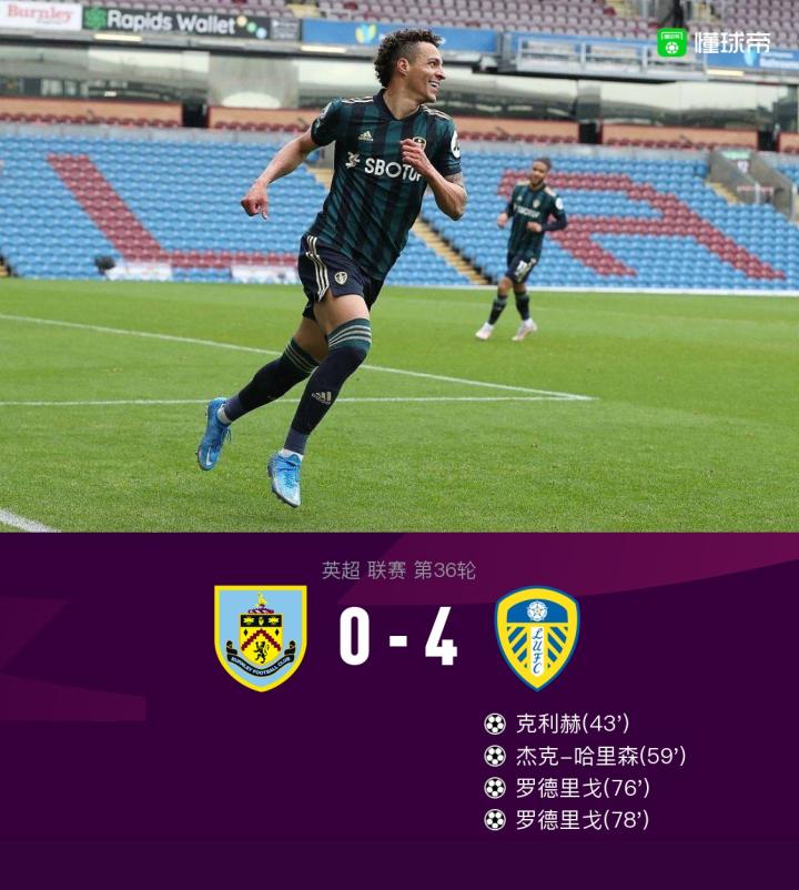第79分钟,杰克-哈里森将球传入禁区,罗德里戈前插过掉门将后打空门得手,伯恩利0-4利兹联。