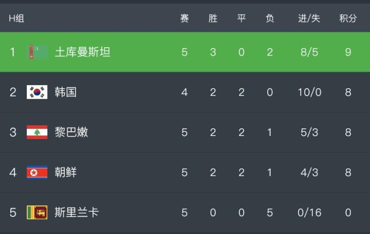 在已经完赛的5场比赛中,朝鲜2胜2平1负积8分,因净胜球劣势排在小组第4。目前亚足联尚未公布朝鲜退赛后,各队与朝鲜还未进行的比赛将如何判定,H组的积分将如何计算。