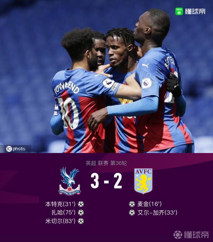 水晶宫3-2逆转维拉,麦金、本特克、扎哈破门,米切尔传射