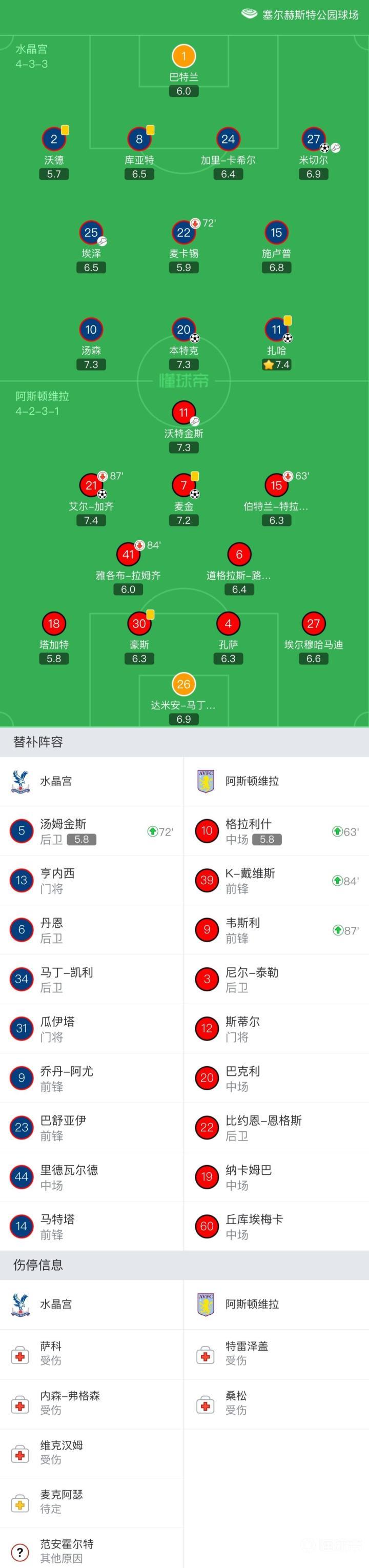 水晶宫首发:1-巴特兰、2-沃德、8-库亚特、24-加里-卡希尔、27-米切尔、25-埃泽、22-麦卡锡(73' 5-汤姆金斯)、15-施卢普、10-汤森、11-扎哈、20-本特克;