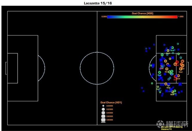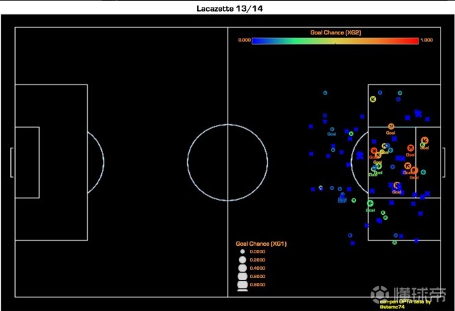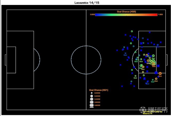 根据这个简单标准来划分的话,拉卡泽特是属于排名前20位的前锋。此外,另一个判断标准则是前锋们创造机会的能力,这就是为什么前锋们自我创造机会造成的进球会得到更高的评价。由于没有一个精准的度量标准,这样的评定办法其实是不完美的,但是如今这已经是评定一名球员和一支球队射门质量的一个最好办法,下图便是拉卡泽特场均进球数据以及运动战射门地点图。