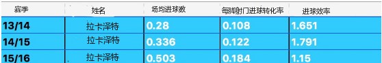 拉卡泽特2015-16赛季的21粒法甲联赛进球中,没有1粒进球是在禁区外攻入的,有很多进球都是干净利落攻入或者补射攻入的。一名射手应该达到的境界是:在合适的时间出现在合适的地方。联赛第37轮和摩纳哥比赛时的帽子戏法,拉卡泽特就展现了类似这样的功力。这场比赛其实关乎着这两只球队谁能直接进入到下赛季的欧冠小组赛,凭借着拉卡泽特的帽子戏法,里昂兵不血刃地以6比1大胜对手。拉卡泽特在比赛中表现得相当高效,相比之下,拉卡泽特之前上演的帽子戏法则更加的精彩。