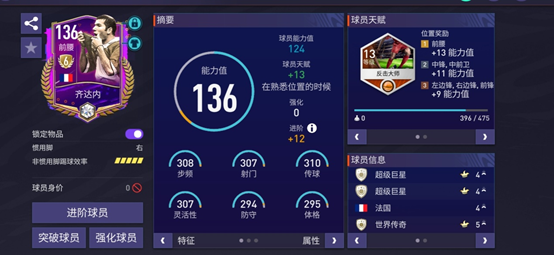 天赋方面,齐达内配备了反击大师天赋,这对于他的远射、长传、敏捷等数据都有一定提升,而作为进攻型中场,如此的加成显然非常适合齐达内。
