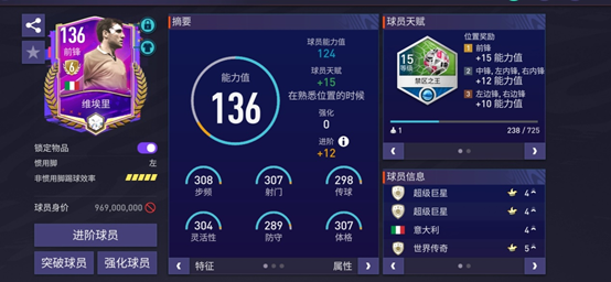 天赋方面,维埃里配备了禁区之王天赋,这对于他的各项终结相关数据加持显著,再加上维埃里自身本就出众的模型,他完全能成为一辆前场坦克。