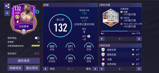 天赋方面,马克莱莱具备顶尖的防守天赋——后方统帅。这对于他的人盯人、铲球、力量的加成非常大,而且还大大提升了他的加速数据,使得他攻守兼备。