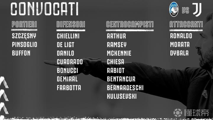 后卫:基耶利尼、德利赫特、达尼洛、夸德拉多、博努奇、德米拉尔、弗拉波塔