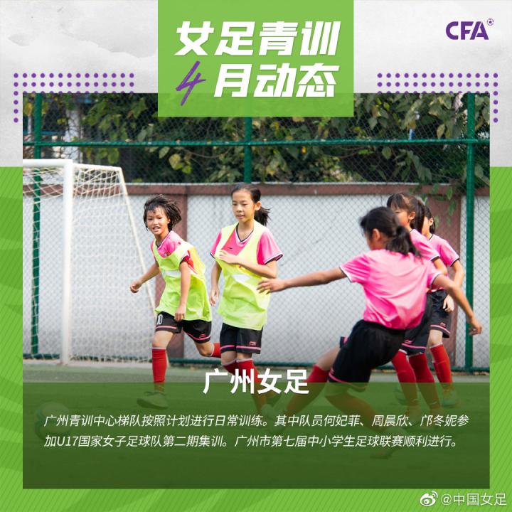 2021年女足青训4月工作动态:广州女足广州青训...中国女足 @懂球帝2021-05-20 11:322021年女足青训4月工作动态:广州女足 广州青训中心梯队按照计划进行日常训练。其中队员何妃菲、周晨欣、邝冬妮参加U17国家女子足球队第二期集训。广州市第七届中小学生足球联赛顺利进行。展开更多