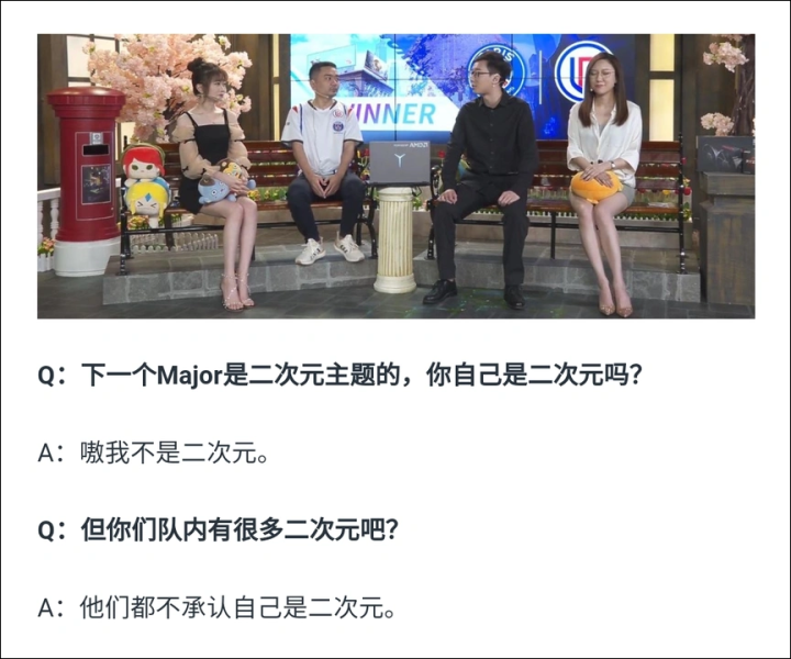 口是心非的情状,不仅限于玩家社群,观看Dota2的职业比赛也会有同样的感觉。以至于现在这帮职业队各个二次元浓度爆表,也没人感到奇怪。