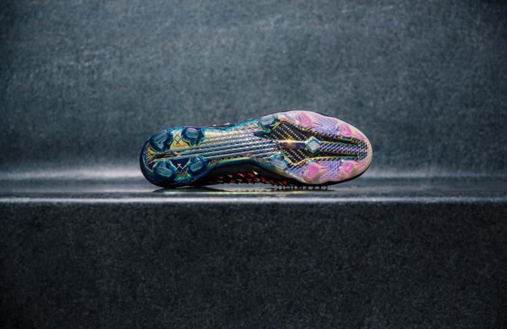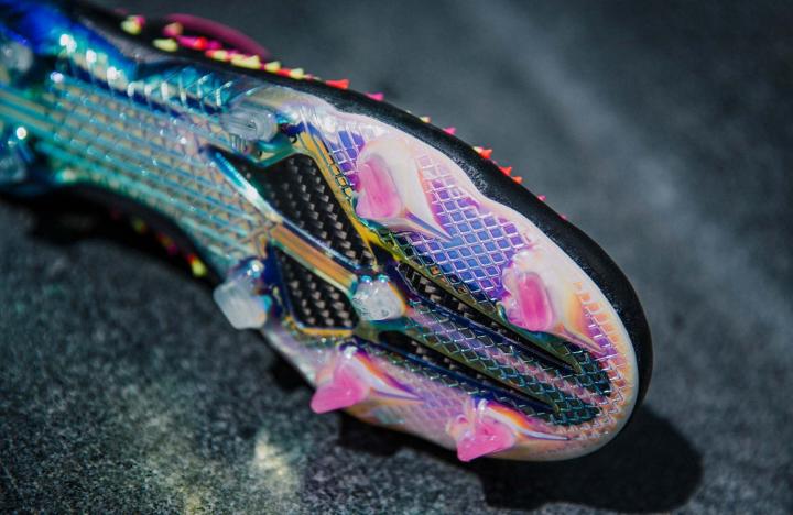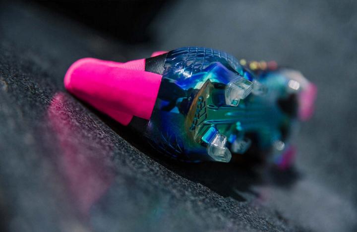 最后,这种品牌各系列间的融合还体现在配色上。传统的黑色鞋面搭配白色阿迪达斯胜利三条纹,鞋口以及一体化鞋舌则以艳丽的粉红色装饰,同时鞋钉也加入粉色装饰。鞋面上的橡胶锐刺则由粉色与黄色所组成,带有电镀涂层的大底更是为球鞋的颜值增色不少。