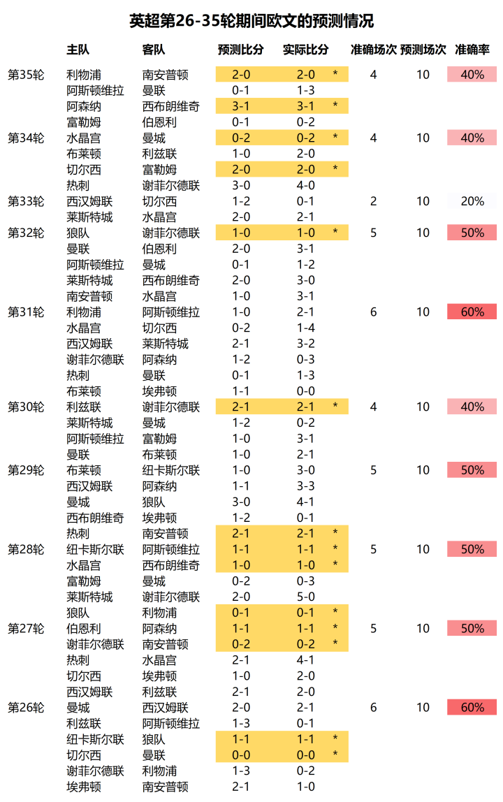 上图中列出的所有比赛场次为欧文预测比赛胜负准确的场次,其中用黄色及*标记的为比分准确的场次。