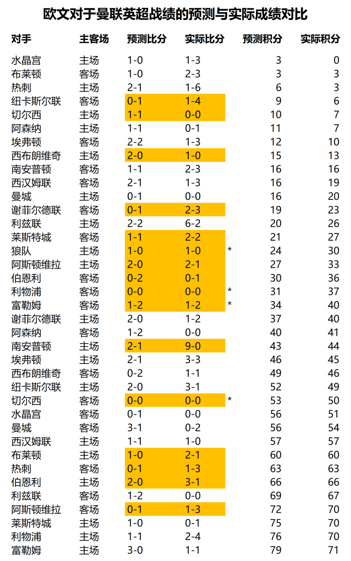 在这里,我们列出了曼联在37个英超比赛日的比赛结果与欧文预测的结果对比,并基于欧文预测的结果计算了他预测的曼联积分变化情况。其中黄色标记部分为胜负预测准确场次,*标记的则为比分预测准确场次。