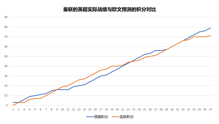 既然基于欧文对于曼联英超比赛的预测进行了积分计算,那么也不妨从数字和折线图来看一看其与实际积分的变动情况及差异。