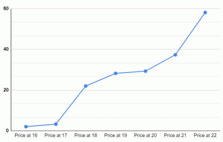 如果我们看一下这些转让发生的年龄,会发现平均年龄是19.01岁。年龄本身并没有太大的帮助,但如果搭配上每个年龄段的平均价格,那么它就可以作为我们衡量风险的标准。当一支球队签下一名16岁的球员时,价值通常会比较低,因为这名球员无法兑现天赋的概率要大得多。但随着时间的流逝,我们对一个球员应有水平的认识会变得越来越清晰,所以他们的价格自然会随着时间的推移而水涨船高。