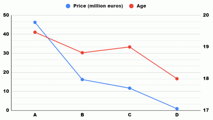 在接下来的图表中,我们可以比较不同类别的球队的顶级年轻球员的费用是多少,以及他们在什么年龄段转会去了那里。我们已经提到了哪些球队属于A类(顶级球队)。对于B类,我们选取了经常参加在欧战的球队(多特蒙德、摩纳哥、阿森纳、塞维利亚或阿贾克斯等等)。对于C类,较小联赛的顶级球队和其他五大联赛的球队(埃弗顿、萨索洛、萨尔茨堡红牛、萨格勒布迪纳摩)。对于较小的球队,我们将他们分进了D类,包括像沙勒罗瓦(比利时)、恩波利(意乙)或莫尔德(挪威)这样的俱乐部。