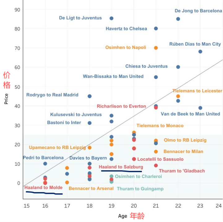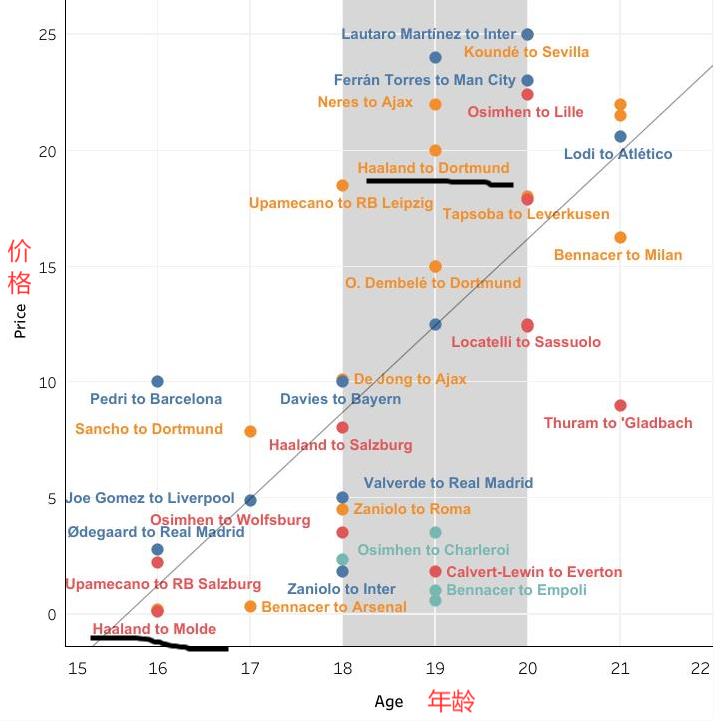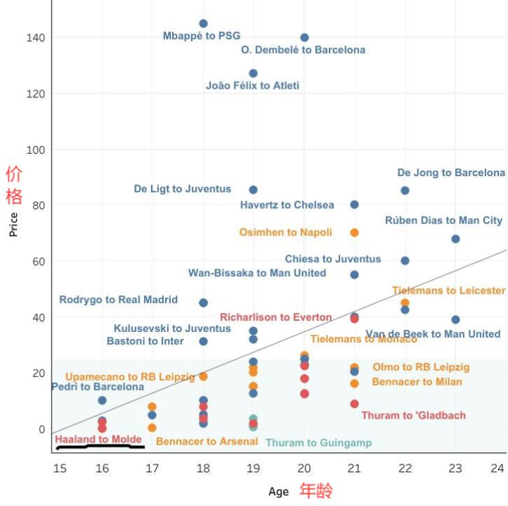 看了这些球员到现在为止的所有动向,我们可以了解到,俱乐部为一个顶级天才在23岁之前支付的平均价格是2592万欧元。但由于其他因素的影响,比如年龄、买卖方俱乐部状况等,价格会有很大的差异。从转会费的中位数来看,是1620万欧元。在所有有顶级青年才俊参与的情况下,有一半的球员的转会费是低于1620万欧元的。