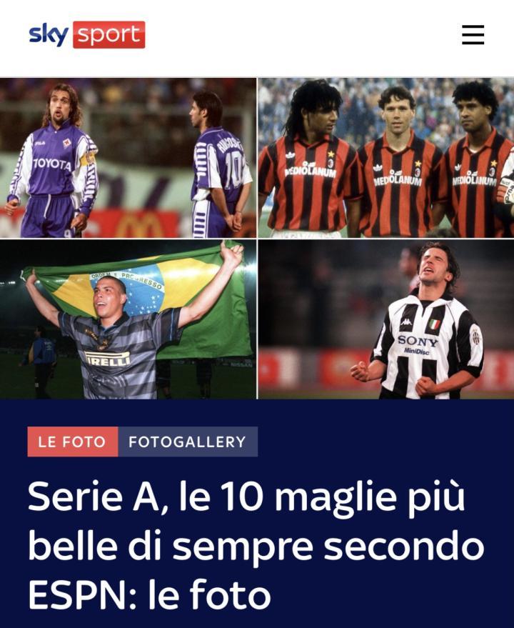 日前,英国媒体《天空体育》评选出了“意甲历史最美球衣TOP10”,榜单中的球衣绝大部分都出自于21世纪前的意甲赛场。
