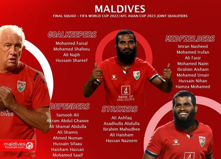 马尔代夫公布世预赛大名单,全部球员均来自马尔代夫国内联赛。6月3日,马尔代夫将与中国队交锋。