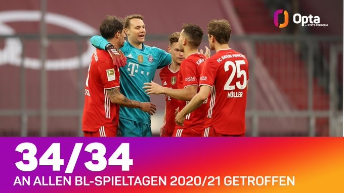 这是德甲联赛历史上第三次有球队在单赛季的每一轮联赛都取得进球,但一共只有两家俱乐部做到过。