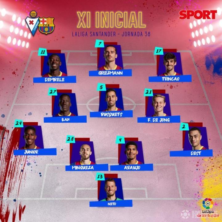 巴萨首发出炉:科曼重回4-3-3阵型巴萨完整首发...每日体育报 @懂球帝2021-05-22 23:15巴萨首发出炉:科曼重回4-3-3阵型 巴萨完整首发如下: 13-内托; 24-菲尔波,28-明格萨,4-阿劳霍,2-德斯特; 27-莫里巴,5-布斯克茨,21-德容; 11-登贝莱,7-格列兹曼,17-特林康。展开更多