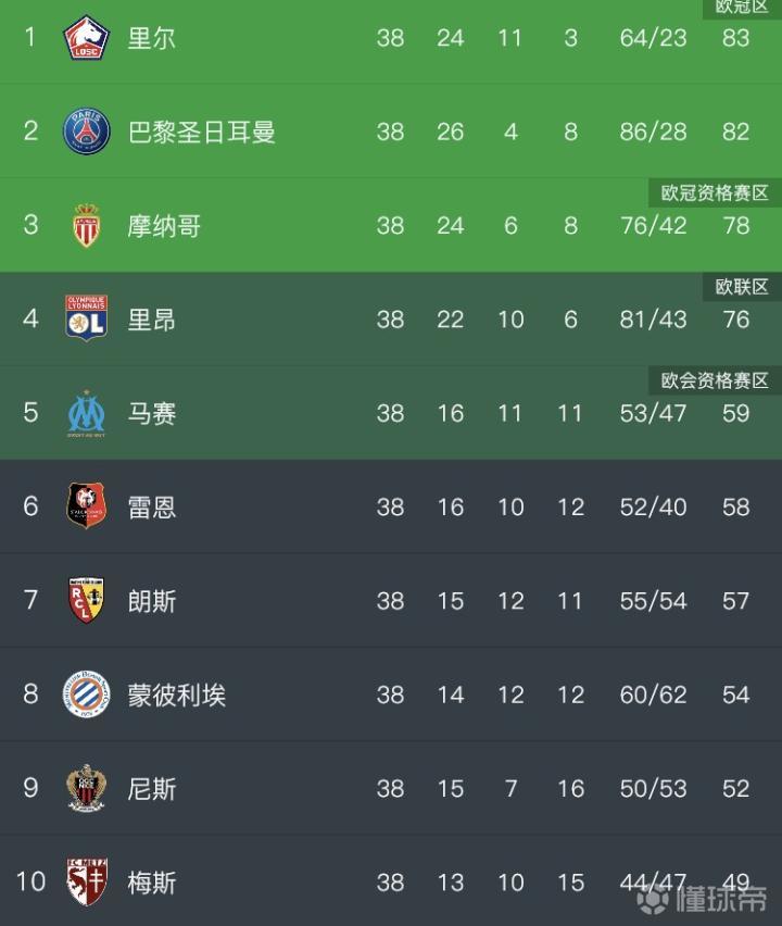 法甲大结局:里尔时隔10年重夺冠军,巴黎、摩纳哥获欧冠资格