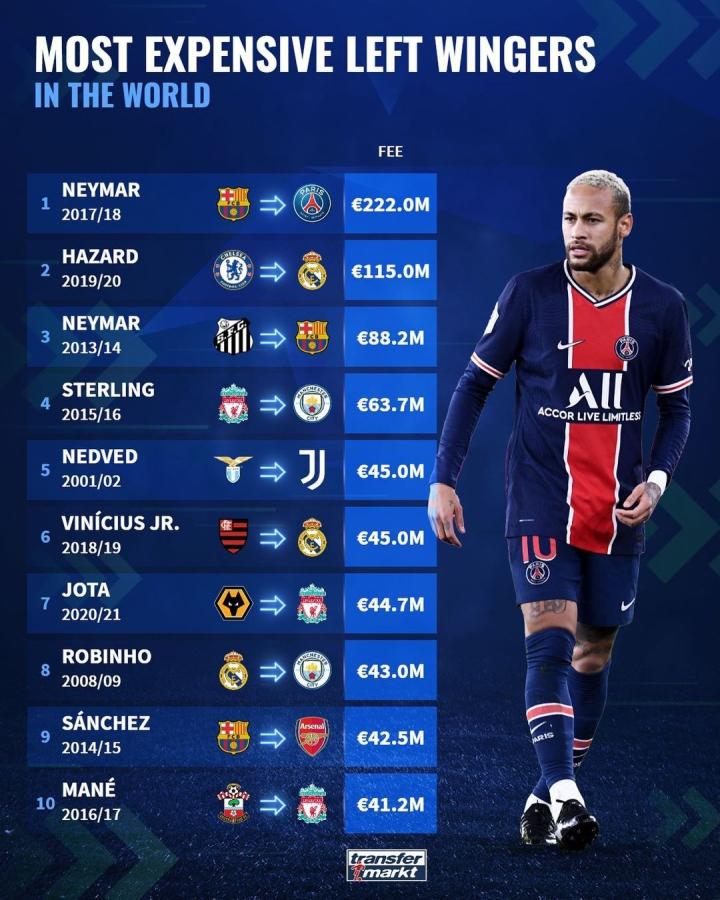 德国转会市场网站盘点了世界足坛历史上左边锋转会费排行榜,巴黎球星内马尔以2.22亿欧高居榜首,阿扎尔加盟皇马时的1.15亿欧排名第二。
