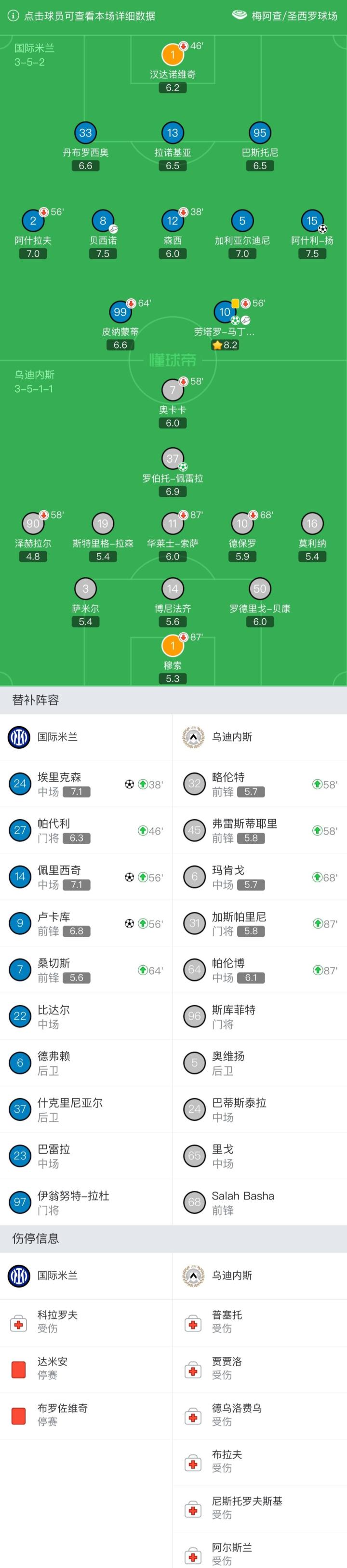 下半场,帕代利替补登场换下汉达诺维奇,这位35岁的国米二门将在本赛季结束后告别国际米兰,加盟本场的对手乌迪内斯。