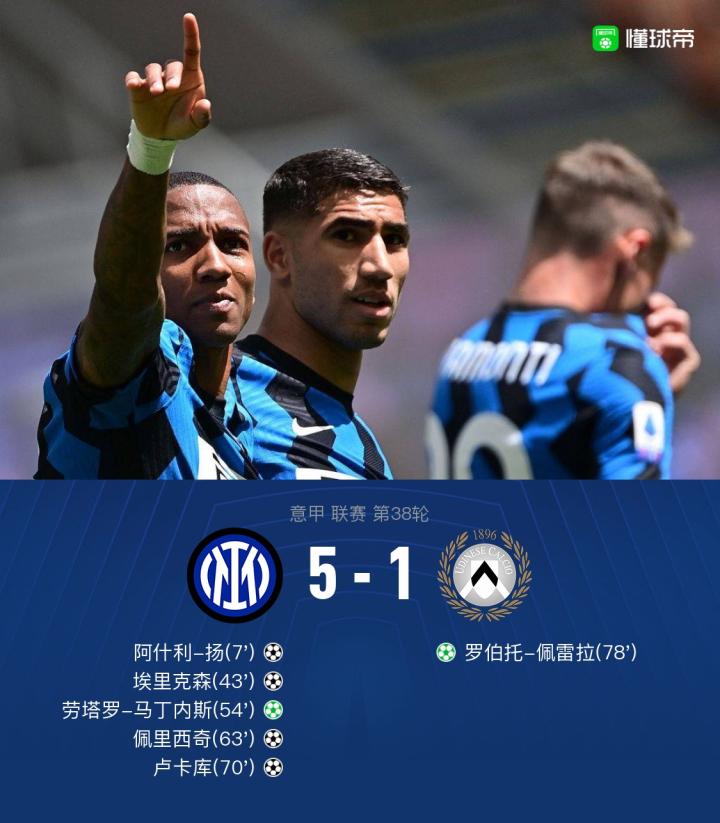 北京时间5月23日21:00,意甲联赛末轮的一场较量,国际米兰坐镇梅阿查球场,迎战乌迪内斯。上半场,阿什利-扬首开记录,森西因伤被埃里克森换下,临近补时阶段埃里克森任意球直接破门,国际米兰暂时2-0乌迪内斯;下半场,阿什拉夫造点,劳塔罗主罚命中,贝西诺助攻佩里西奇扩大比分,桑切斯的射门击中立柱后打在卢卡库身上弹进球门,之后埃里克森送点,罗伯托-佩雷拉点射扳回一城。