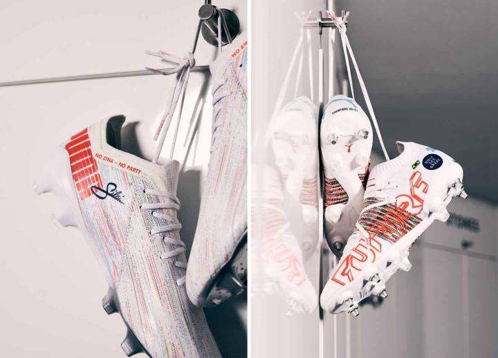 ENJOYZ足球为了庆祝曼城赢得本赛季英超联赛冠军,PUMA邀请其“御用”球鞋定制艺术家silni.art为其队中所有签约球员打造了一系列个性化战靴,并在本赛季最后一场与埃弗顿的比赛前赠送给球员们。